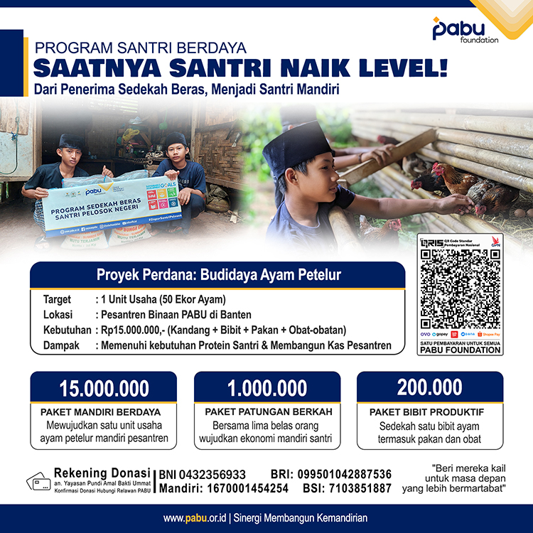 Hanya dengan 15 juta rupiah, satu pesantren pelosok bisa mulai melangkah menuju kemandirian ekonomi. Bayangkan pahala jariyah yang terus mengalir dari setiap butir telur yang menjadi tenaga bagi para santri untuk menghafal ayat-ayat Allah.