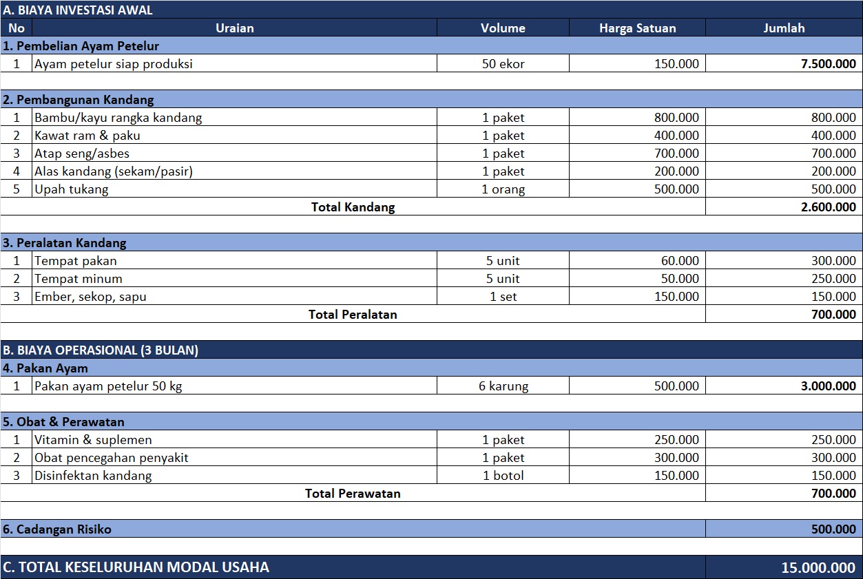 Kami telah menyusun Rancangan Anggaran Biaya (RAB) yang sangat terjangkau namun berdampak luas. Dengan total donasi Rp15.000.000,-, kita dapat mewujudkan satu unit usaha ayam petelur yang terdiri dari:
