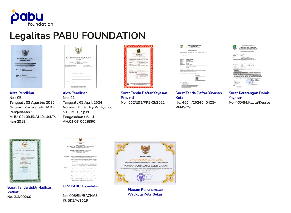 Yayasan Pundi Amal Bakti Ummat (PABU FOUNDATION) adalah Lembaga nirlaba milik masyarakat yang bergerak di bidang sosial, Pendidikan, Kemanusiaan, dan Keagamaan yang didirikan pada Tanggal 3 Agustus 2015 di Kota Bekasi, Jawa Barat. Tujuannya adalah mewujudkan kepedulian pada generasi muda khususnya anak-anak yatim dan dhuafa sekaligus menjadi Jembatan antara orang Berada dengan orang Miskin. Sehingga tercipta masyarakat Madani yang sejahtera lahir dan batin.
